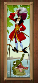 In them, Captain Hook takes the place of the ballerina who teeters precariously on a rope strung above a waiting alligator; Cruella De Vil and her henchmen sink in the quicksand; Maleficent sits atop a gravestone of a clobbered companion; and the Queen of Hearts stands atop a bucket of red paint (instead of a barrel of dynamite).