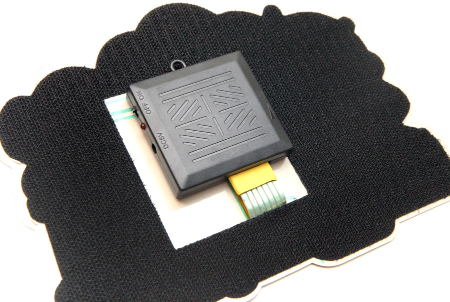 The graphic is easy to remove from the shirt as it’s attached by hook and loop fasteners. Once removed, you can see the controller where the primary power switch and sound sensitivity dial are located. Once turned on, there is a secondary power button that is activated by pressing on the front of the design. The controller can be charged using a USB cord, which also comes packaged with the shirt. Finally, instructions on how to use the light-up device are included.