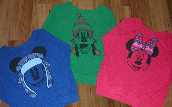 I couldn’t resist showing you these, as they are one of our most popular items. However, I do have to warn you – there are limited sizes available in stores right now at the Disneyland and Walt Disney World Resorts. For those of you visiting the Disneyland Resort, look for the sweaters at Disney Clothiers, Bonanza Outfitters, Gone Hollywood and World of Disney Store. At the Walt Disney World Resort look for these three sweaters, as well as this next one featuring Pie-Eyed Mickey and Minnie Mouse at World of Disney Store, Tren-D, MouseGear and Emporium among other select locations. Quantities, styles and sizes are limited, so keep an eye out and be sure to grab one. If you can’t find your size, double check again in early December, when we expect to receive more.